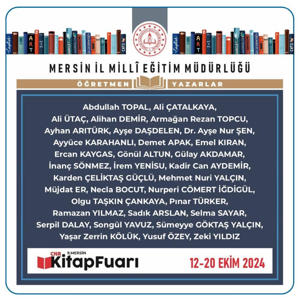 Mersin il milli eğitim Müdürlüğü tarafından yazar öğretmen olarak 9. Mersi CNR Kitap fuarında okurlarımız ile bulaşacagız.